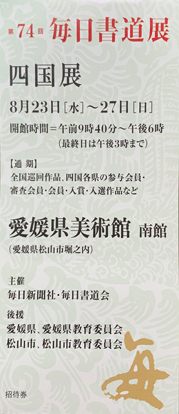 第74回 毎日書道展 四国展 【松山市】 開催期間 2023年8月23日(水)~8月27日(日) 会場名 愛媛県美術館 南館 住所 愛媛県松山市堀之内 開館時間 9:40~18:00(※最終日15:00まで) About テクポ事務局 View all posts by テクポ事務局 →