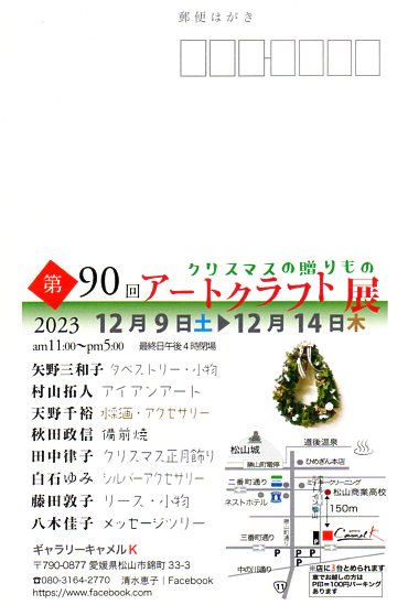 第90回アートクラフト展 【松山市】 開催期間 2023年12月9日(土)~12月14日(木) 会場 ギャラリーキャメルK 住所 愛媛県松山市錦町33-3 連絡先 080-3164-2770 開場時間 11:00〜17:00(最終日は16:00) About テクポ事務局 View all posts by テクポ事務局 →