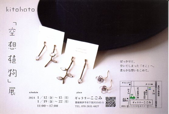 kitohato「空想植物」展 【伊予市】 開催期間 2024年1月12日(金)~15日(月) / 1月19日(金)~1月22日(月) 会場 ギャラリーこごみ 住所 愛媛県伊予市下吾川1543-5 連絡先 070-2631-4427 開場時間 11:00〜17:00 About テクポ事務局 View all posts by テクポ事務局 →