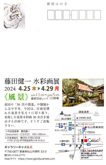 藤田健一 水彩画展 【松山市】 開催期間 2024年4月25日(木)~4月29日(月) 会場 ギャラリーキャメルK 住所 愛媛県松山市錦町33-3 連絡先 080-3164-2770 開場時間 11:00〜17:00(最終日は16:00) About テクポ事務局 View all posts by テクポ事務局 →