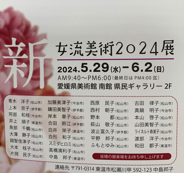 新女流美術2024展 【松山市】 開催期間 2024年5月29日(水)~6月2日(日) 会場 愛媛県美術館 南館 県民ギャラリー2F 住所 愛媛県松山市堀之内 開館時間 9:40~18:00(※最終日16:00まで) About テクポ事務局 View all posts by テクポ事務局 →