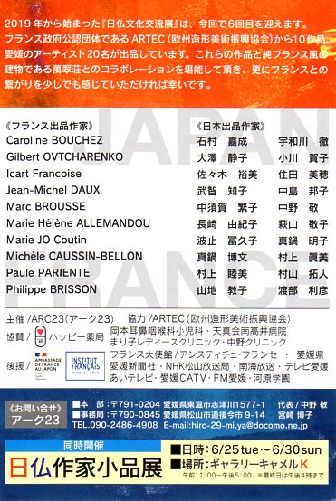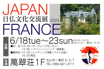 日仏文化交流展2024 【松山市】 開催期間 2024年6月18日(火)~6月23日(日) 会場 萬翠荘 住所 愛媛県松山市一番町3丁目3-7 開場時間 9:00~18:00(最終日は16:00まで) 連絡先 089-921-3711 About テクポ事務局 View all posts by テクポ事務局 →