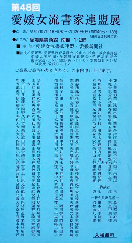 第48回 愛媛女流書家連盟展 松山市 開催期間 2025年7月16日(水)~20日(日) 会場 愛媛県美術館 南館 1・2階 住所 愛媛県松山市堀之内 開館時間 9:40~18:00(最終日は16:00まで) About テクポ事務局 View all posts by テクポ事務局 →