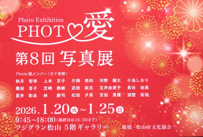 Photo愛 第8回写真展 松山市 開催期間 2026年1月20日(火)~25日(日) 会場 フジグラン松山 5階ギャラリー 住所 愛媛県松山市宮西1丁目2-1 開場時間 9:45~18:00(最終日は16:30まで) 関連 About テクポ事務局 View all posts by テクポ事務局 →