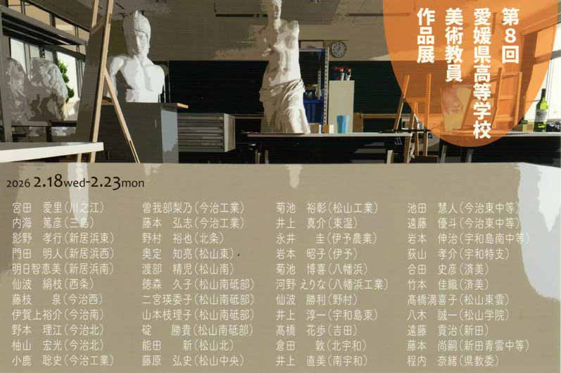 第8回 愛媛県高等学校 美術教員作品展 松山市 開催期間 2026年2月18日(水)~2月23日(月) 会場 愛媛県美術館 南館 住所 愛媛県松山市堀之内 開館時間 9:40~18:00(最終日は16:00まで) About テクポ事務局 View all posts by テクポ事務局 →