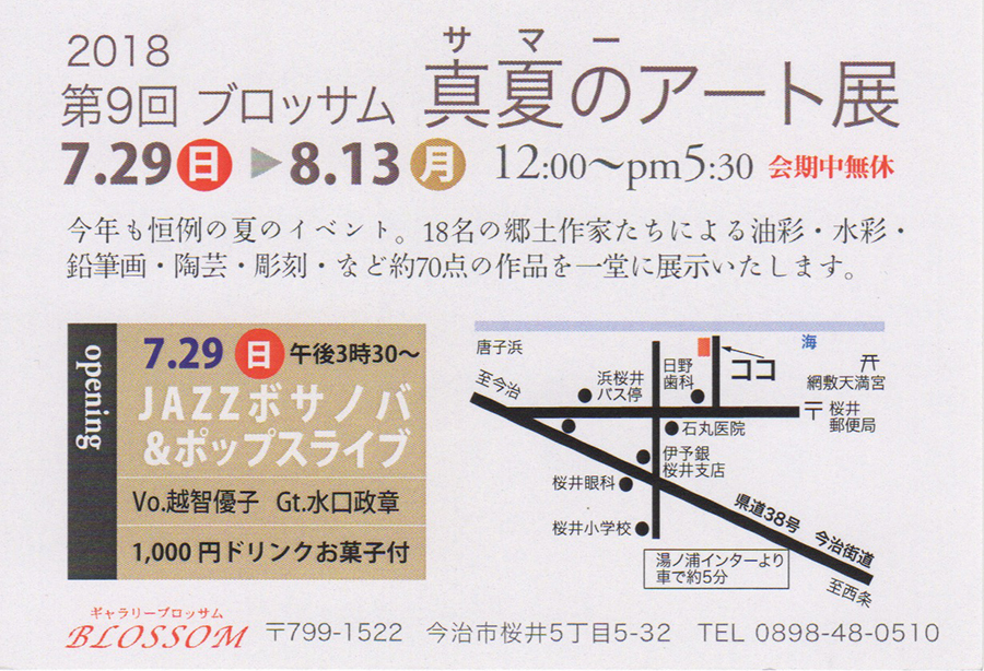 サマーアート展 【今治市】 開催期間 2018年7月29日(日)~8月13日(月) 会場 ギャラリーブロッサム 住所 愛媛県今治市桜井5丁目5-32 連絡先 0898-48-0510 開場時間 12:00~17:30 サマーアート展 関連 About テクポ事務局 View all posts by テクポ事務局 →
